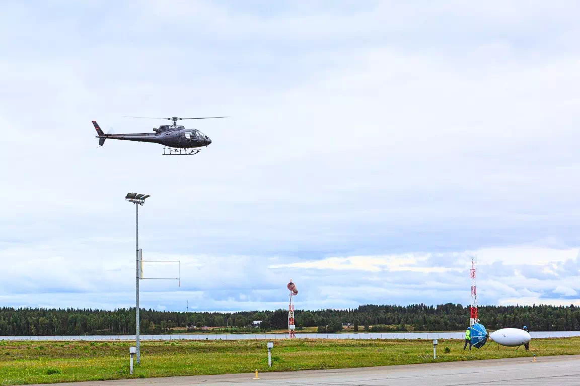 - Semi-airborne electromagnetic (EM) method: Morning flights focused on the semi-airborne electromagnetic (EM) method. Here, the team used a powerful ground-based transmitter (running at 1000 volts and up to 10 amperes) that sent electrical currents into the ground through electric grounding fields placed 2–5 km apart. The airborne QAMT system then measured the magnetic footprint, seeing how these currents spread below the surface, down to about 1km. In total, six flights were carried out to investigate the Juomasuo deposit, covering an area of about 40 km².